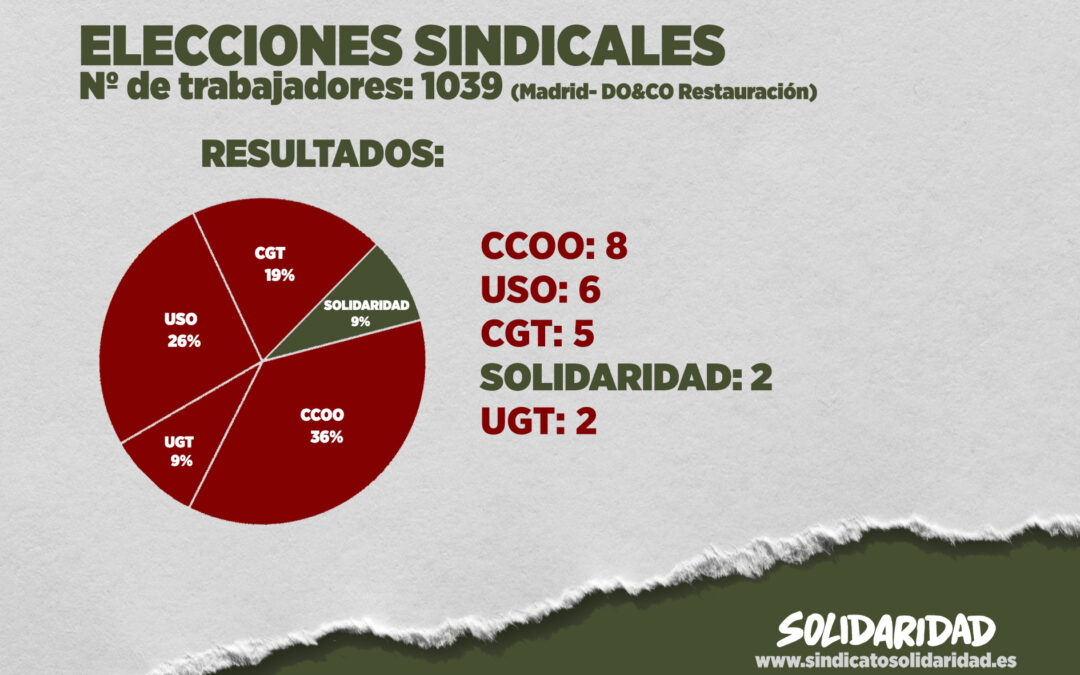 El sindicato Solidaridad ha logrado representación en las elecciones sindicales celebradas en la empresa DO&CO (Madrid), donde trabajan 1.039 empleados. Solidaridad ha conseguido 2 delegados, consolidándose como una alternativa sindical en el sector de la restauración colectiva. En las anteriores elecciones, el sindicato no consiguió representación; sin embargo, cuatro años después y con mucho trabajo, los trabajadores de Solidaridad lo han conseguido.